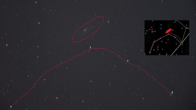 A photo of the Andromeda Galaxy (M31) and part of the constellation Andromeda, as seen from my Nikon D90.