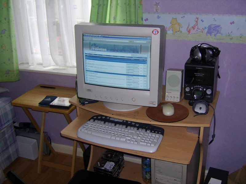 This is my awesome PC. I have 2 mice because I am too lazy to plug in the good one. My radio is also there with my kick-ass hueg headphones. There is like a million hard drives at the bottom there and one bottle of juice.