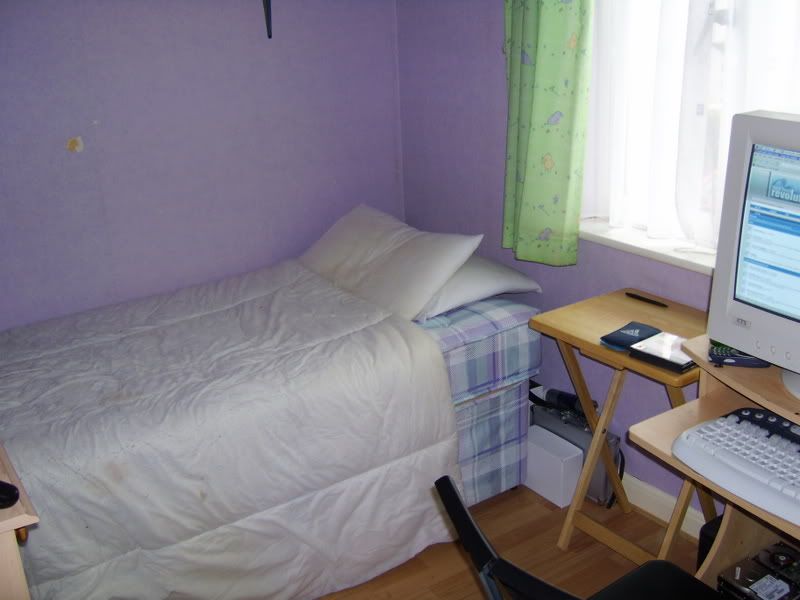 This is my bed. It hasn't had sheets on it for like, a year. Guitar hero hides behind it. The table is for putting things on.