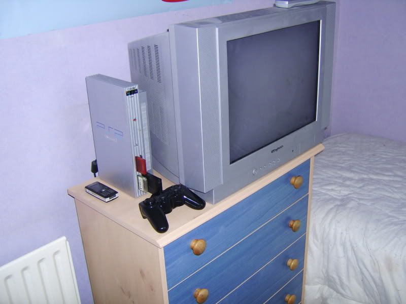 This is my dusty TV. It is dusty. Those drawers contain my legions of random crap, most of which I don't actually need/want but am too lazy to sort through.