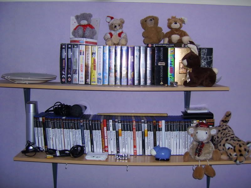This is my shelves above my bed. They contain more crap. There are videos, DVDs, Games, Drumsticks, Batteries, Random Wires that I don't know what to do with, a hair-dryer because I'm a massive ******, and a Kamikaze headband. It has recently become a home for all kinds of dangerous creatures such as leopards, sheep and chocolate bunnies. I am afraid to disturb them.